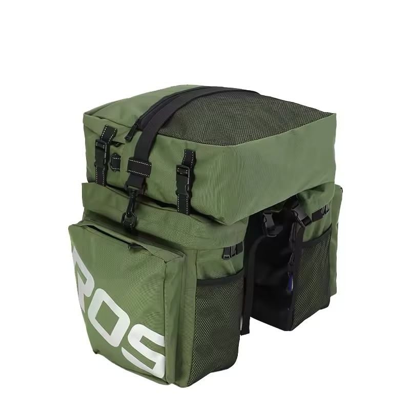 Túi baga đa năng 3 trong 1, phù hợp cho những chuyến đi xa. Làm từ vải Oxford 900D/1000D với thiết kế đóng cuộn và vỏ bọc mưa chống nước. Tương thích giá đỡ rộng dưới 6 inch; dung tích mỗi túi bên 16L, tổng sức chứa lên đến 50L. Túi trên có thể tháo rời dùng như ba lô hoặc túi đeo vai.